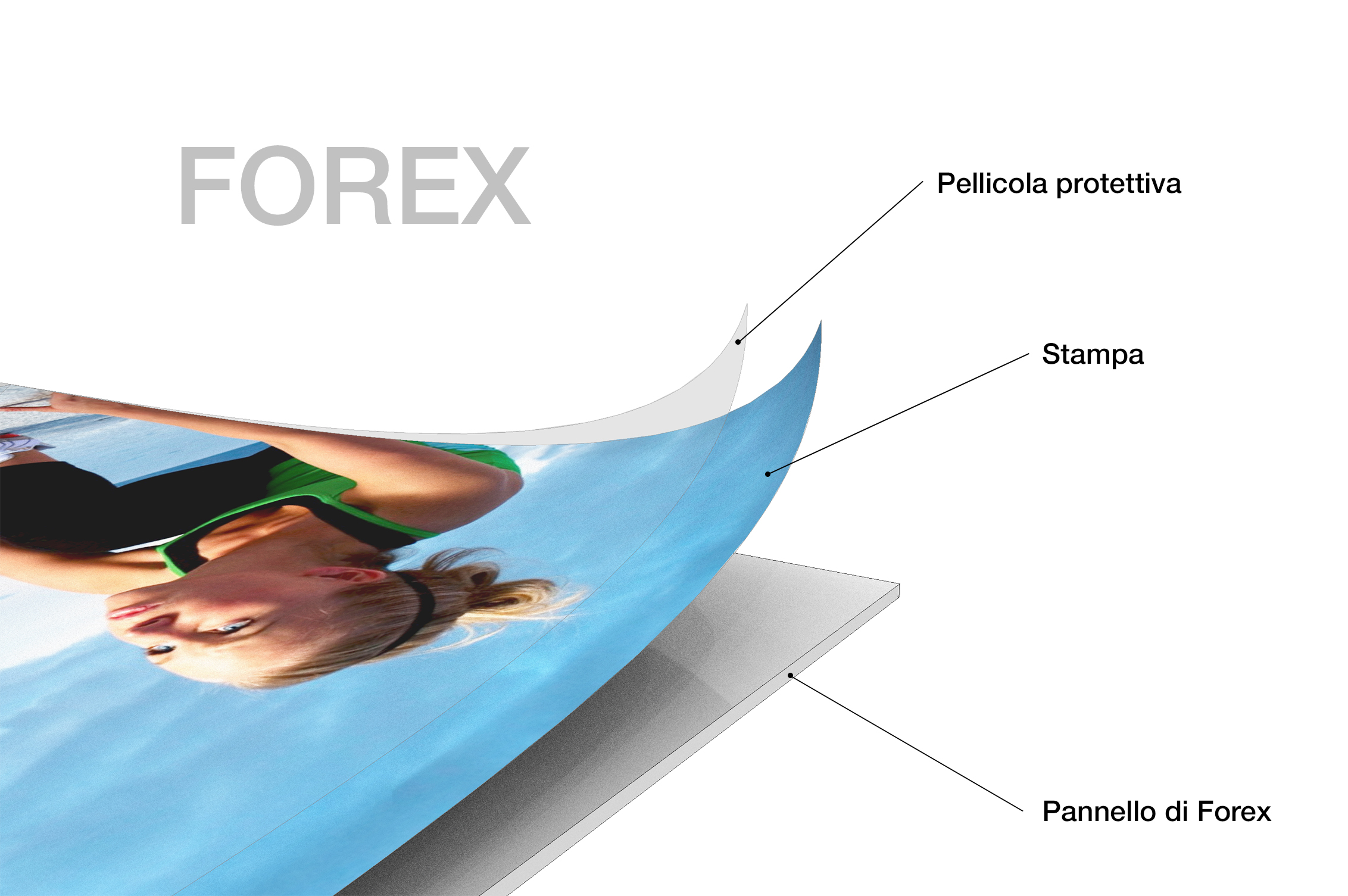 Il forex è un materiale plastico espanso che si presta a molteplici impieghi nella comunicazione visiva e nella fotografia. Può essere stampato direttamente, risultando performante ed economico, o laminato in calandra con le stampe su carta fotografica.